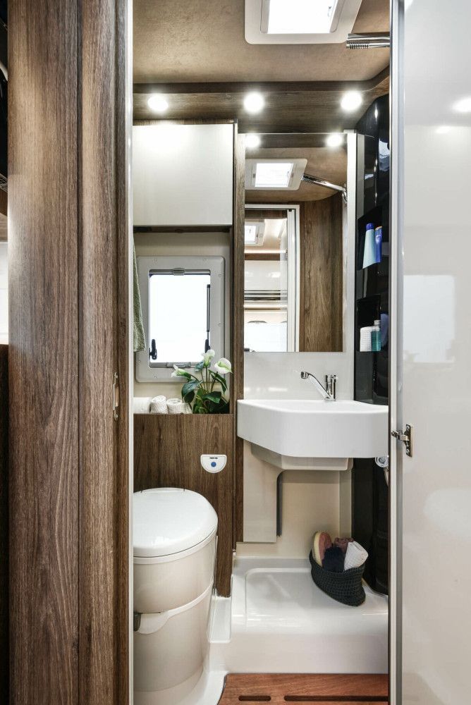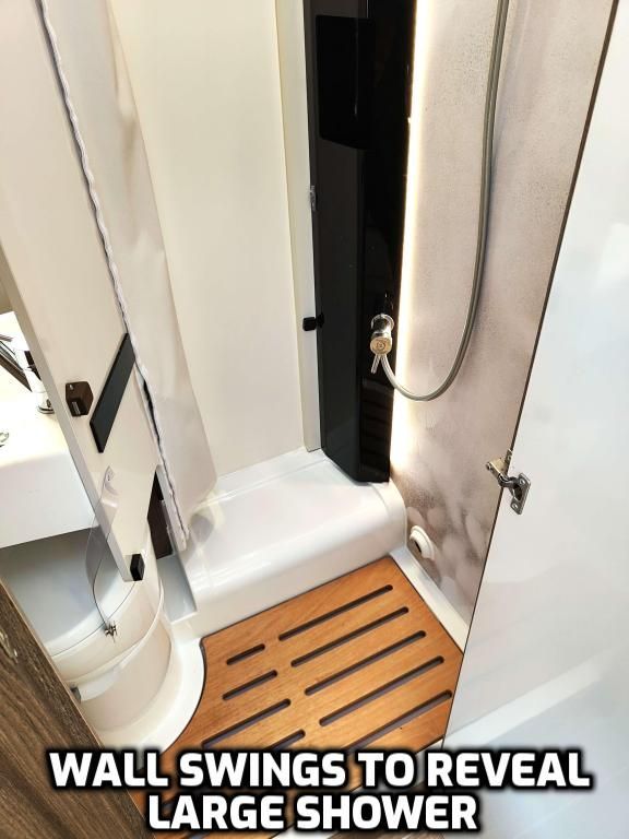 There is a comfortable shower room with basin and WC, a kitchen with oven and 3-ring gas hob, a large fridge/freezer, heating, built-in window blinds and a wide outside locker for your outdoor gear. A bike rack can be added.