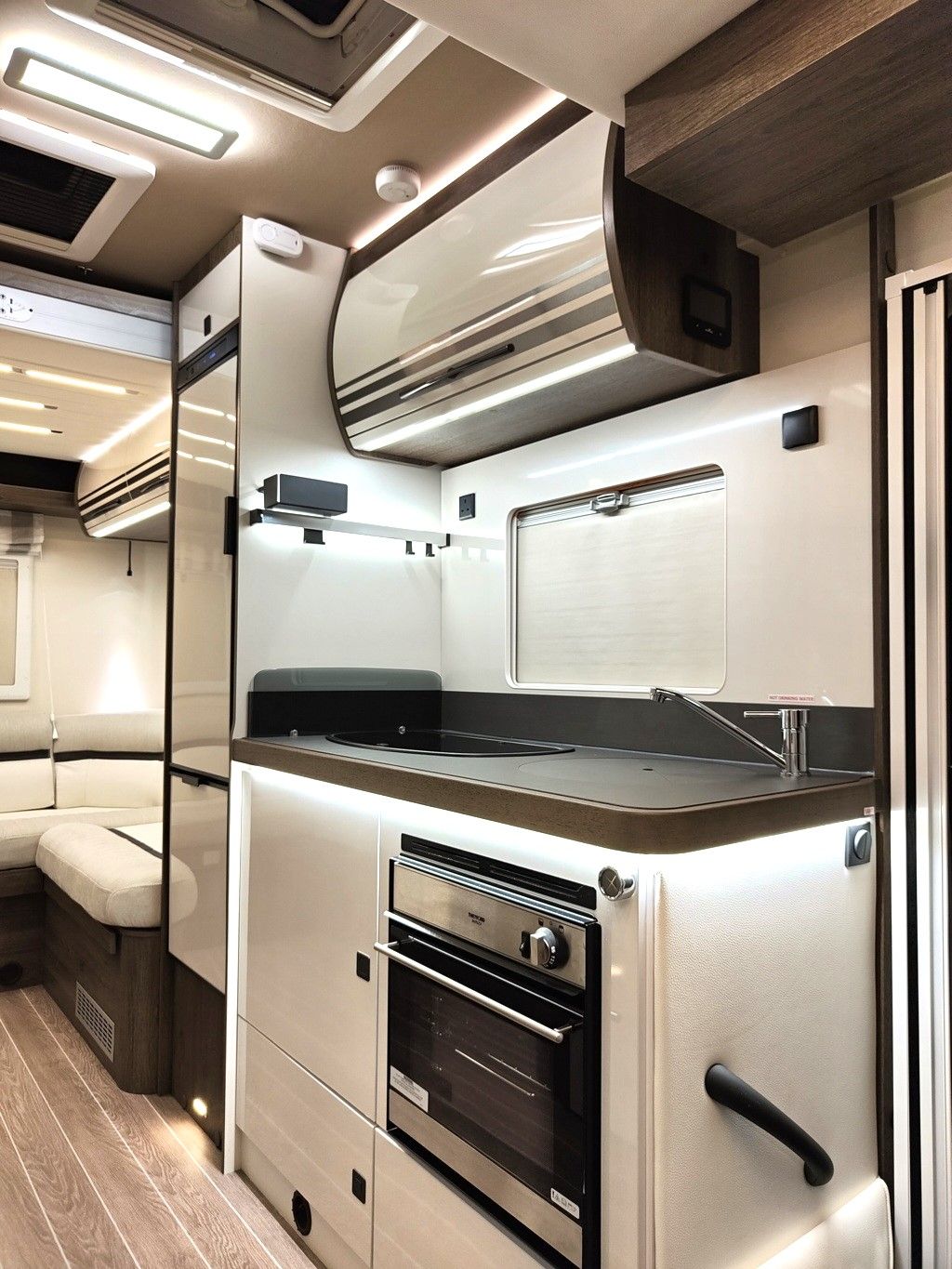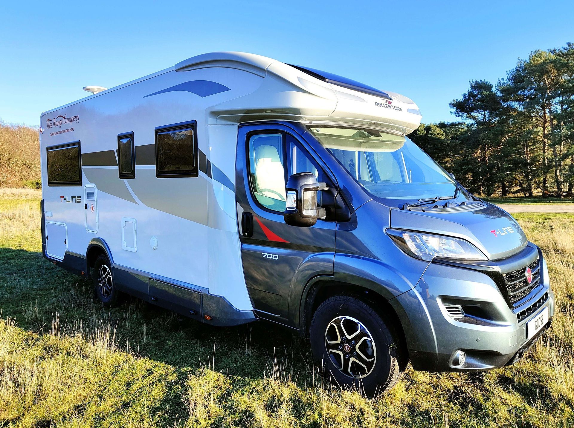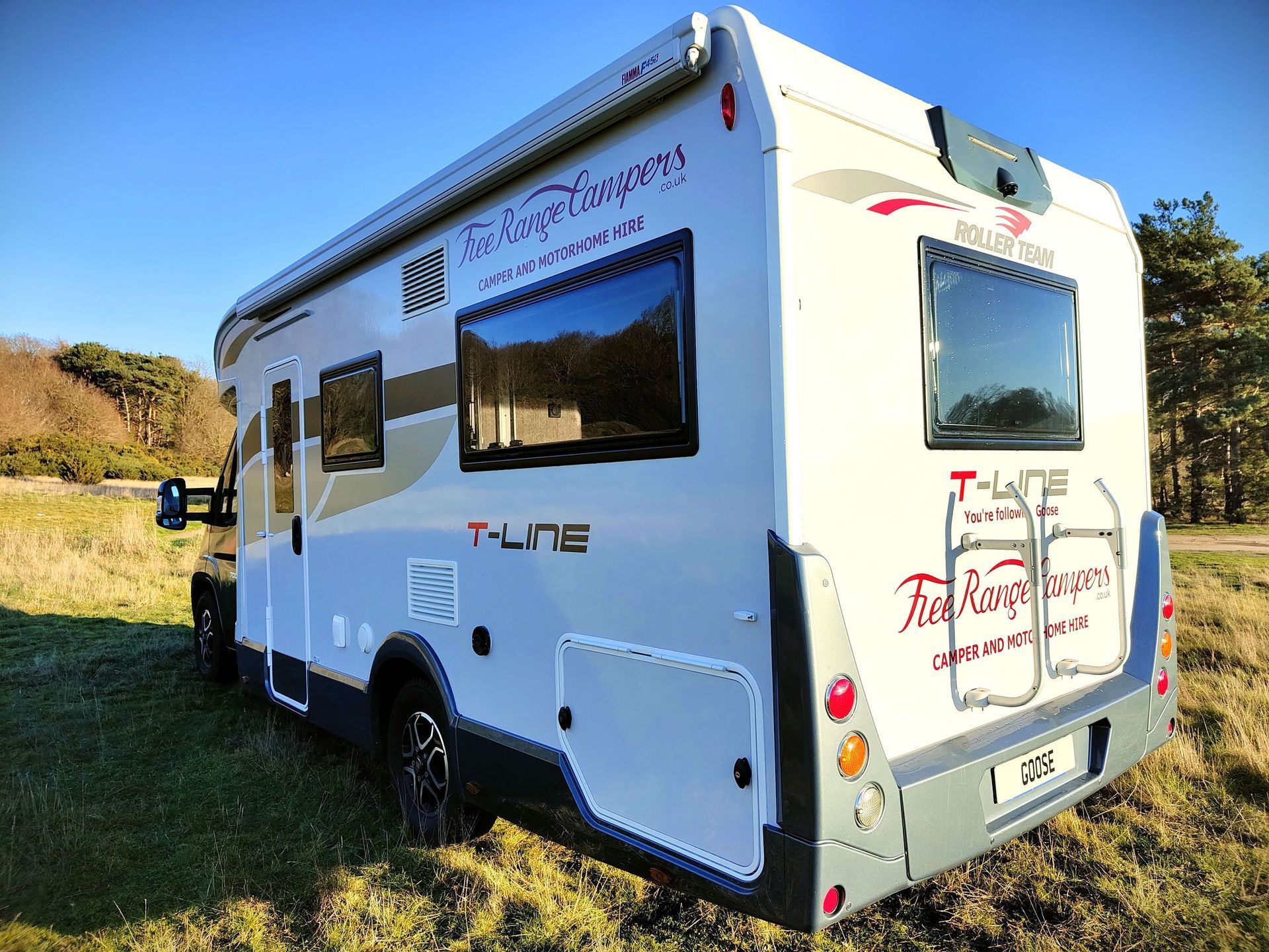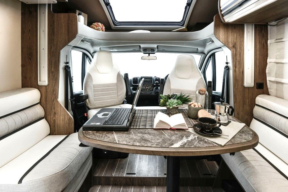 Based on the Fiat Ducato, at 7m long this is a full-sized van offering generous space. Designed for families, sharing friends or couples just wanting the extra space a motorhome offers, Goose has 4 travelling seats, an electric descending double bed at the back above the U-shaped sofas, and another electric drop-down double bed over the dining area. You can also easily make up a third double bed from the lounge sofas, or use them as single twin beds.