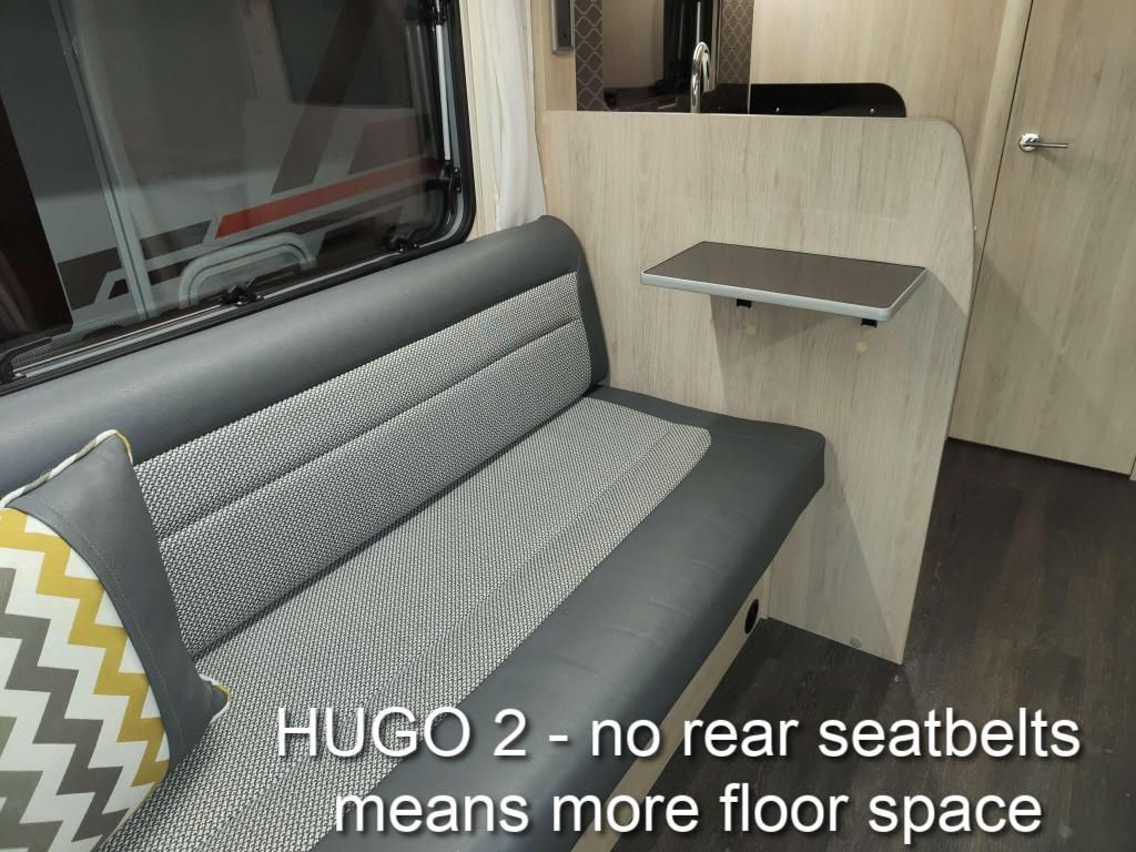 - Hugo1 has 4 seatbelts and Hugo2 has two seatbelts (this also means Hugo2 has more open floorspace)