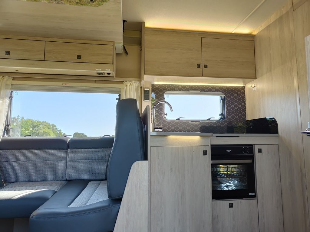 At just 6m long the Hugos are the same length as Piglet, but the extra 40cm width transforms the inside into a spacious, light, open space which seems impossible in such a short vehicle. This is achieved by locating the bathroom at the back of the van across the full width, and using an electric drop-down double bed instead of a fixed rear bed. So you don't need to make up your bed every day - you just push a button and it ascends into the roof, leaving you with a table and seating for up to 6.