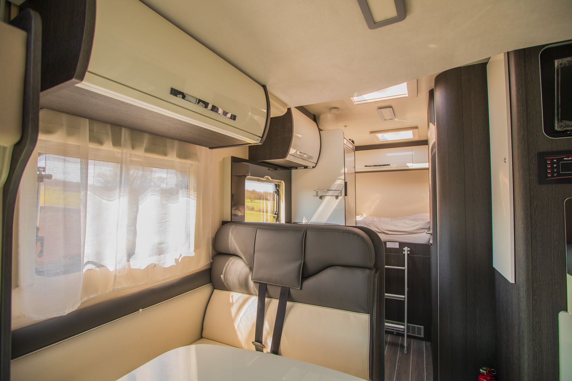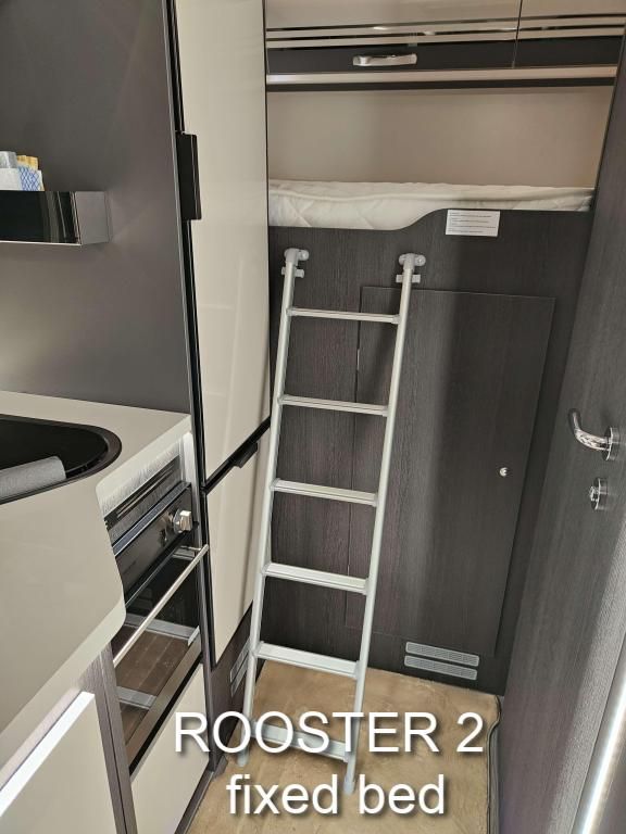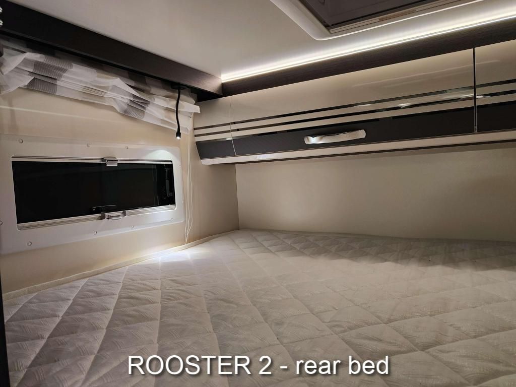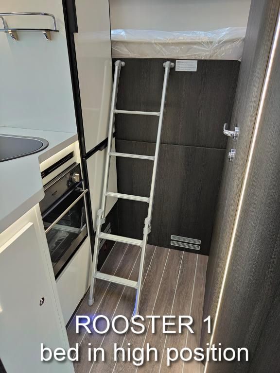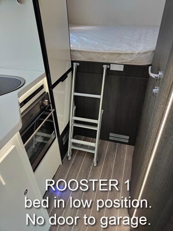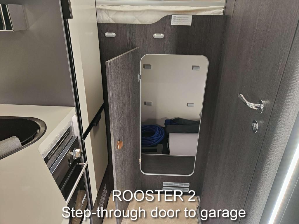 We have two Roosters, both are Roller Team Zefiro 665s with an automatic gearbox. The two vans are identical except that Rooster1 has a height adjustable rear bed, giving more headroom and a shorter ladder. Rooster2's bed is fixed in the higher position, but has a door giving direct access into the garage from inside. Rooster1's garage is only accessible from outside. Please see the photos above.