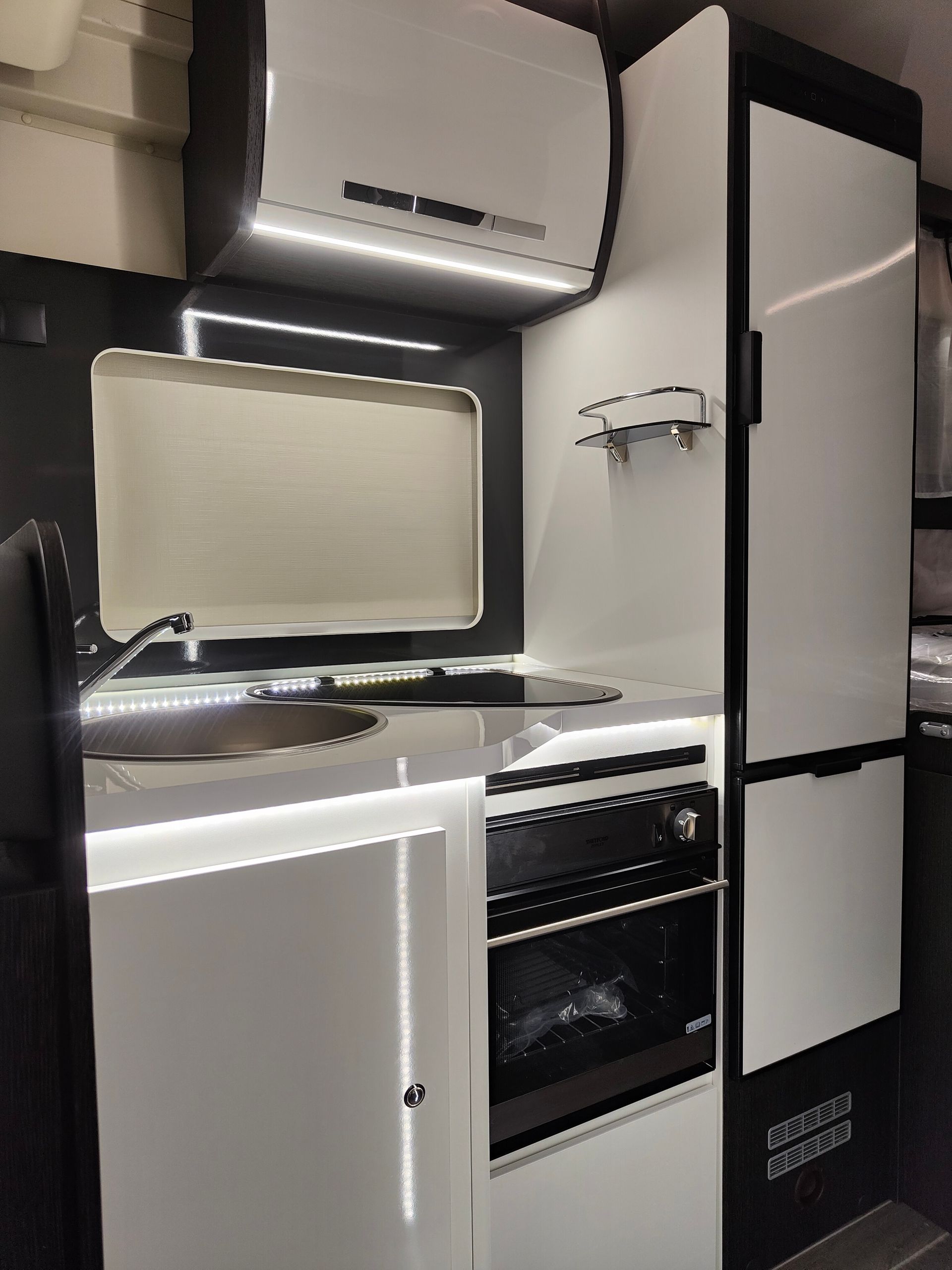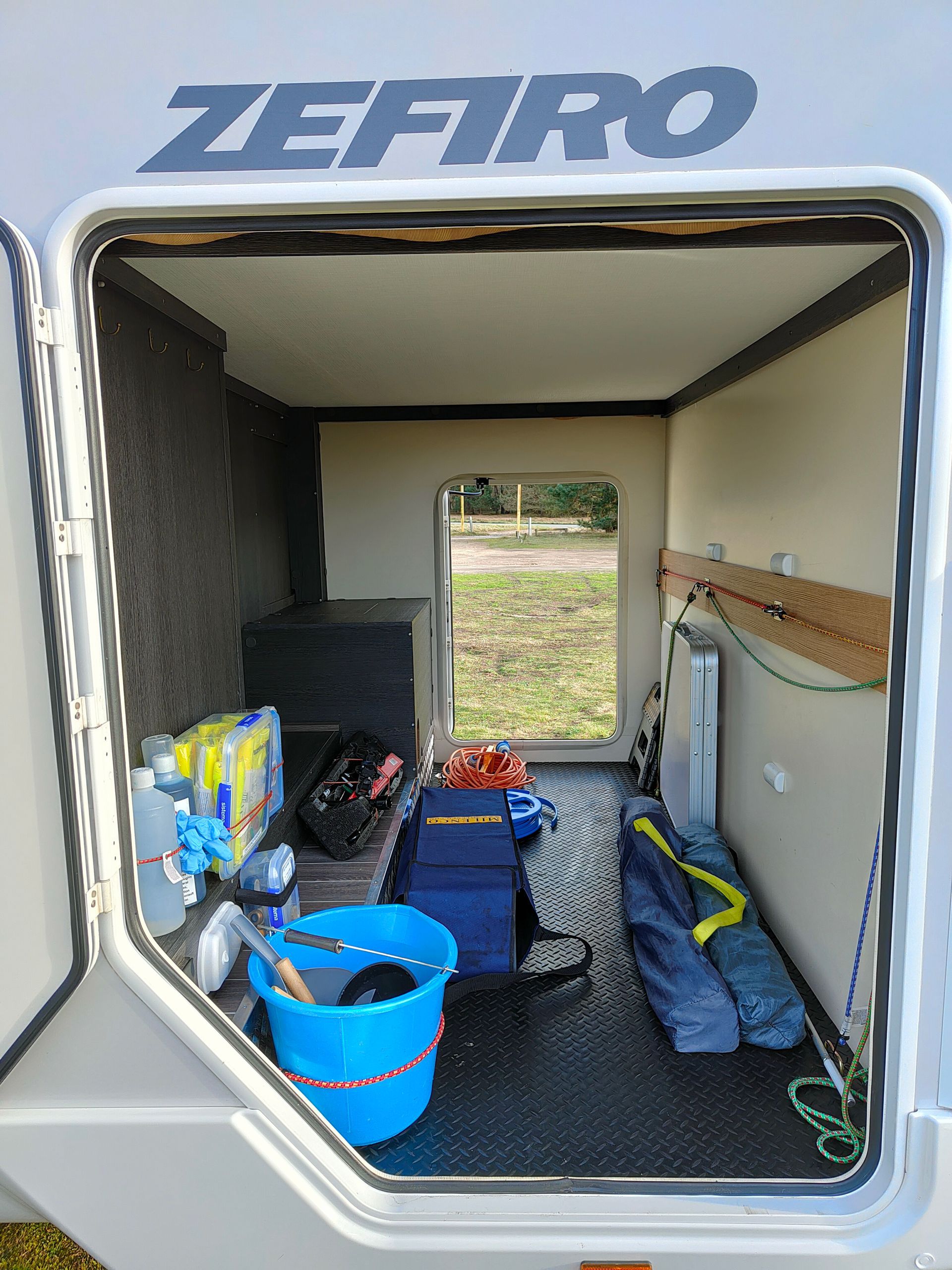 There is a comfortable shower room with basin and WC, a kitchen with oven and 3-ring gas hob, a large fridge/freezer, heating, built-in window blinds and a large locker space ('garage') designed to take several bikes - good if you're concerned about the security risk of them being on a rear rack.