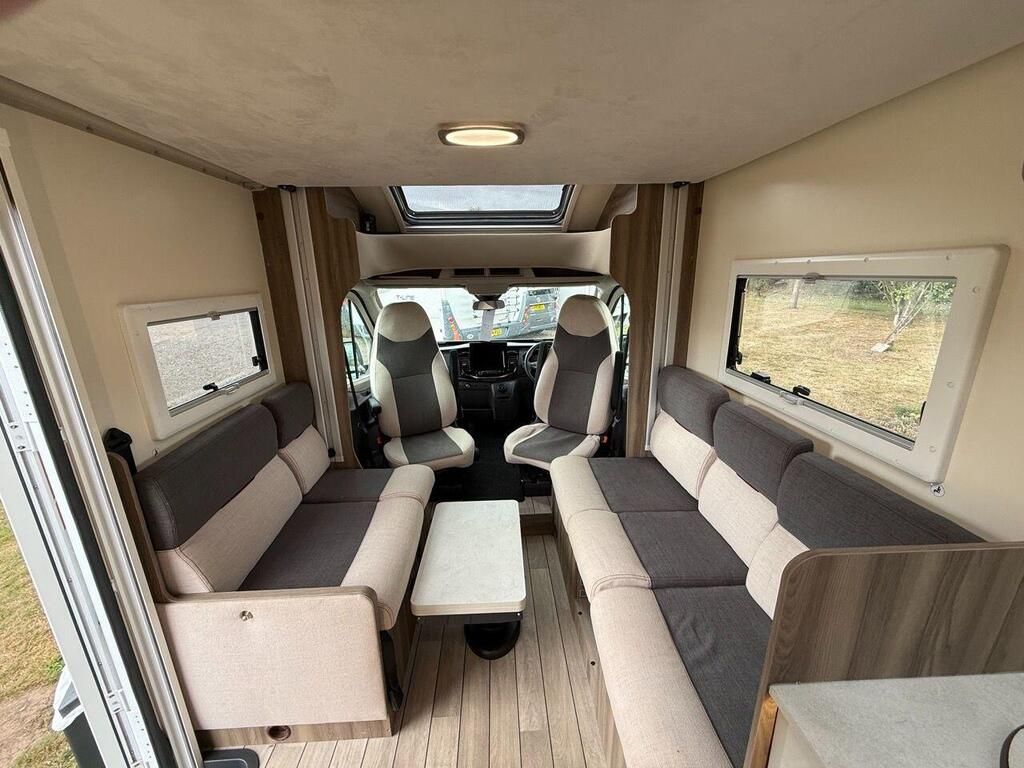 In the kitchen area you'll find a large fridge with freezer section, a sink and a gas hob and oven. The front seats which swivel around to face the parallel sofas, giving a great feeling of openness and space.