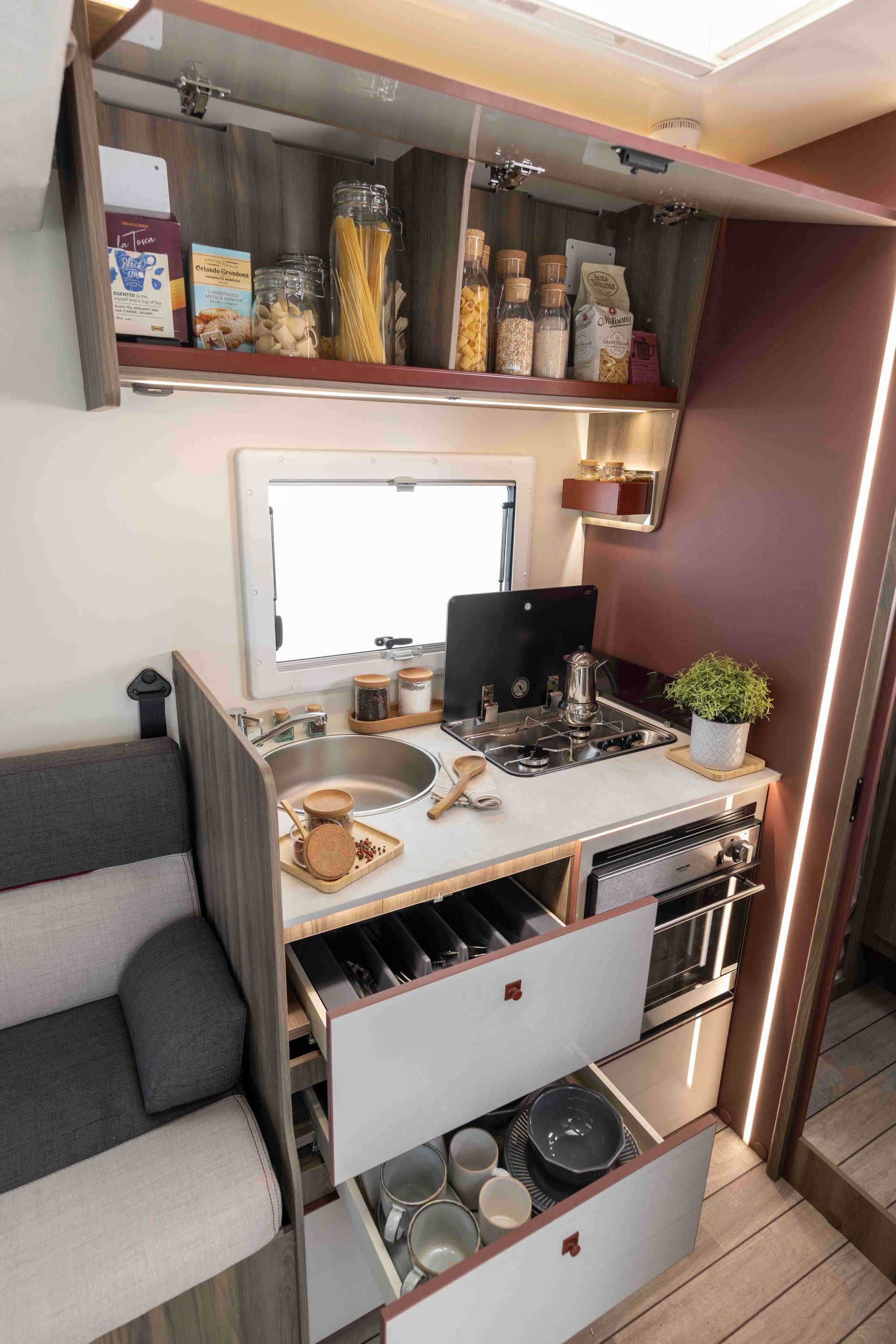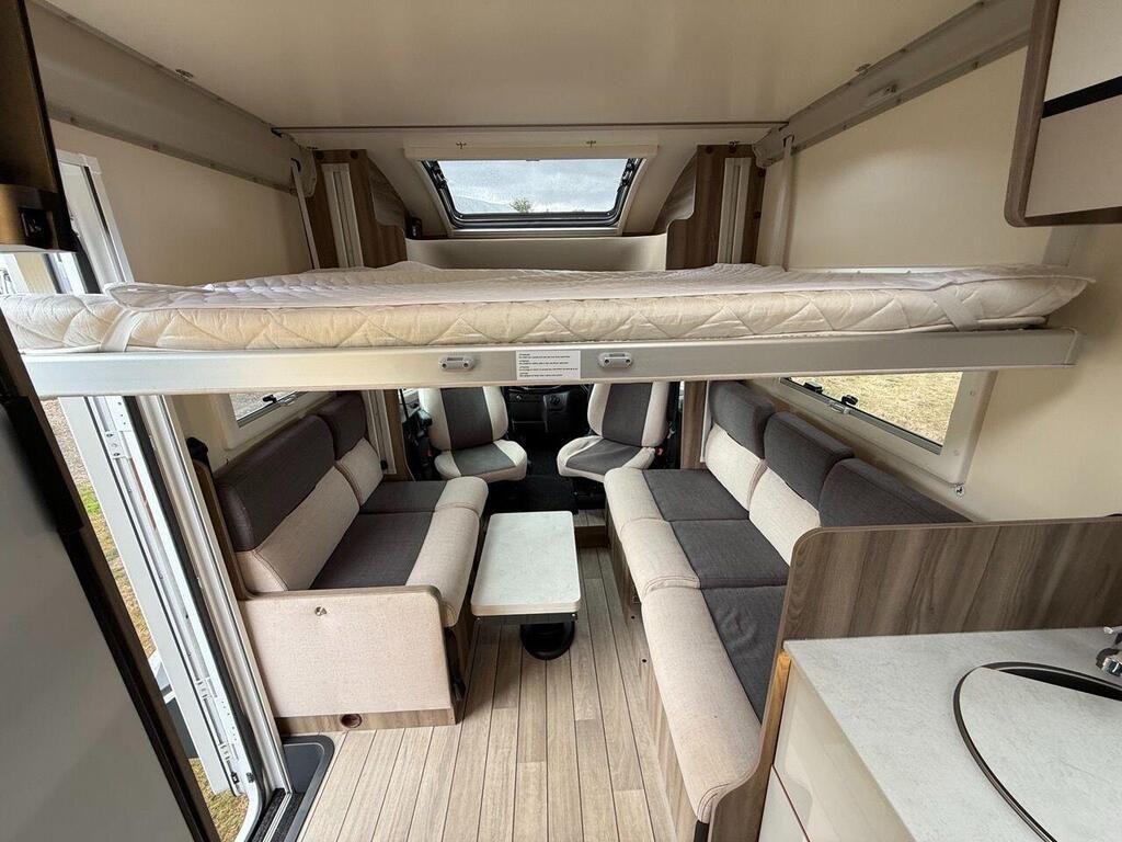 In the kitchen area you'll find a large fridge with freezer section, a sink and a gas hob and oven. The front seats which swivel around to face the parallel sofas, giving a great feeling of openness and space.